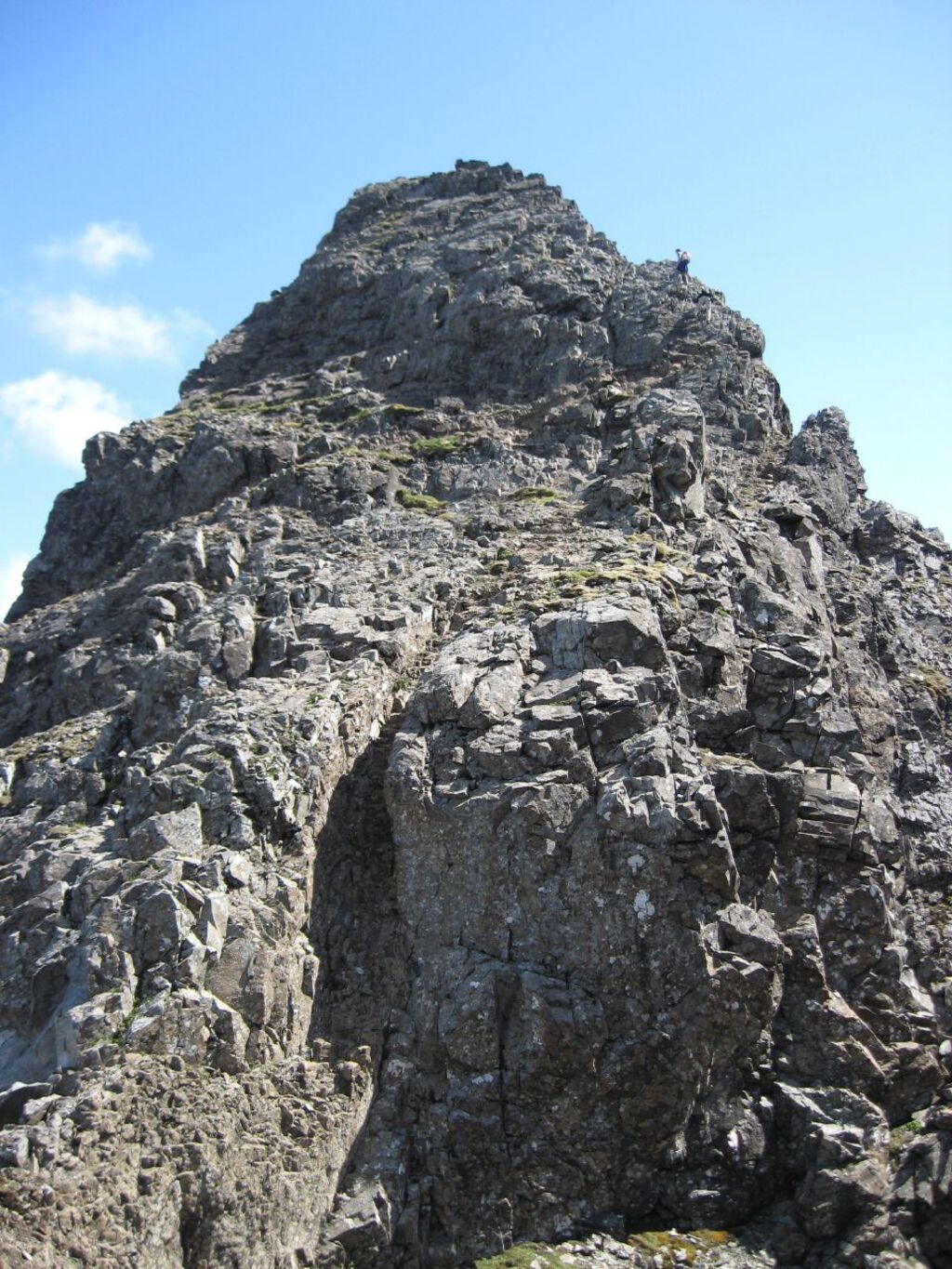 There’s a bit of a breather where the ridge widens a bit before the next section towards the main summit but it was chocka with walkers snaking their way through the contorted pinnacles and ramps, taking their time as it’s a rather tricky section. It’s not quite as exposed as the ridge from the south top but it’s much more complicated route finding and the drops above the east face are just as impressive and intimidating at times if you’re not used to them. From the level section of ridge where we waited for the crowds to pass, we headed straight down the next section, trending left to make a short step across a small gully to access a slightly rising ramp, about a foot wide, that bypassed the very difficult section of wildly exposed knife edge and from the end of the ramp, we crossed to the other side of the ridge, one step wide at this point and slithered down a groove with nothing at the bottom but a worn grassy ledge. Slither too fast and catch your foot on the ledge and it would be curtains here. It’s slightly less exposed on the other side but more complicated route finding and Corncircles was happier with the obviousness of the groove. From the bottom of the groove it’s a couple of steps round the nose of the ridge and the difficulties are more or less over. Unless you fancy tackling the summit block direct, which involves climbing a V Diff nose but the main path runs parallel to the summit ridge, about 20 feet below, until it’s possible to scramble up to the narrow summit.