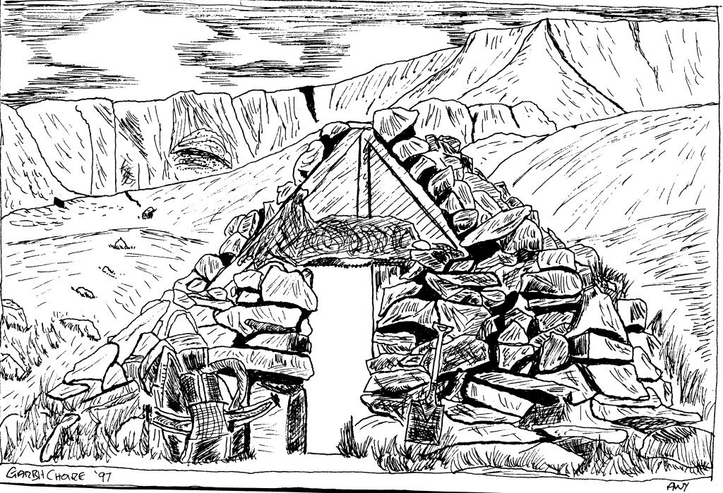 Following on from the discovery of one of my drawings hijacked by the MBA, I found another one while trawling old backups on CD from years ago. This one is of the Garbh Coire refuge below Braeriach in the Cairngorms, 1997. I took a picture the morning we walked out, over Ben Macdui and Carn a’Mhaim and drew it from that. I remember it was hard going through deep heather across the coire towards the Lairig Ghru path. The night we spent in the refuge was superbly wild. I remember gusts of wind developing high up in the coire behind us and roaring downhill to crash into the back of the doss. It didn’t budge an inch though, as it’s a metal A frame covered in hessian matting and large boulders. I seem to remember there was only enough space for 2 or 3 people to lie down, with their feet to the door. It’s a true emergency shelter. We reached it after a wild walk along the plateau, descending the big slabs below Angel’s Peak, which was really exciting! The abiding memory of that wild, remote night, was Penguin running around in the dark, trying to catch his loo roll, with his breeks round his ankles!