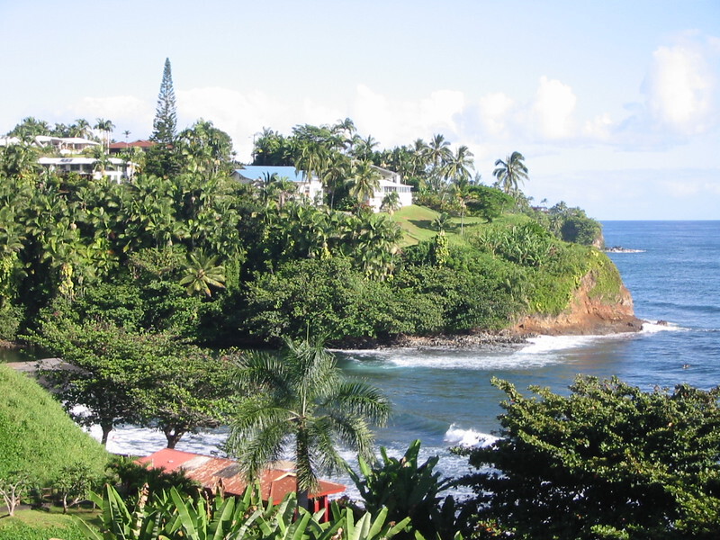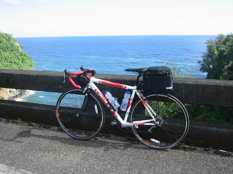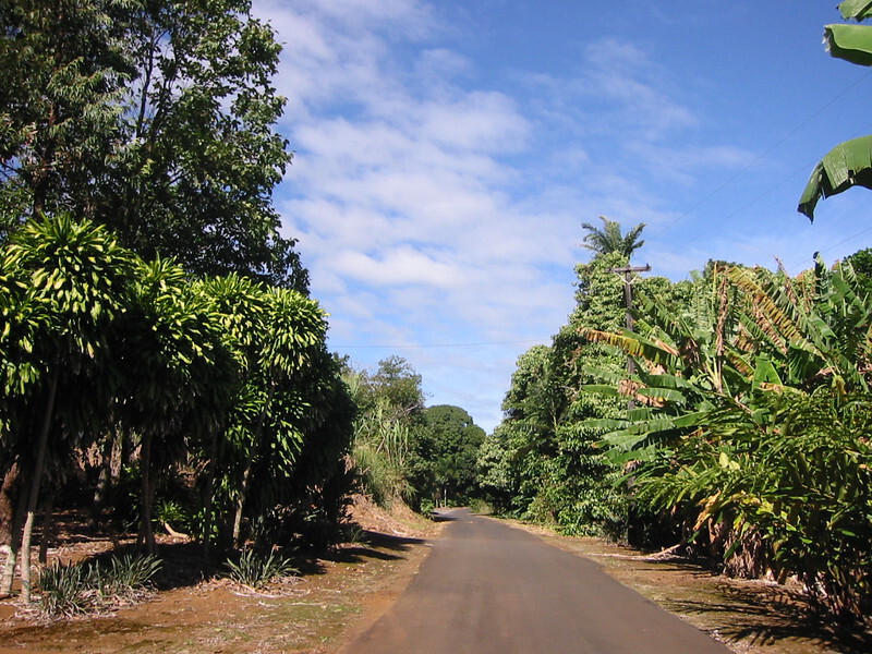After Waikaumalo, you enter gulch territory, which consists of a short climb followed by a screaming twisting descent to the bottom of the gulch, round which the road bends sharply and there was a collection of flowers at every bend. It really is a frightening road, especially if you were driving and not expecting it. The descent is rather steep and at the bottom you don’t get much warning before the road in front disappears and you have to scream round to the right and up the next incline. Some of the gulches are inhabited and there were some very nice spots down by the shore, shielded from the road by the tropical forest and shaded from the sun by swaying palms down at the sea. One other minus point is the lack of a shoulder at the bend! I “took the lane” anyway as it takes a very wide and clean shoulder to keep me on it if I’m doing speed. So, it was out into the traffic, which was almost non existent anyway and a rapid application of the brakes at the bottom, trying to balance safety with a very big run up the next hill!