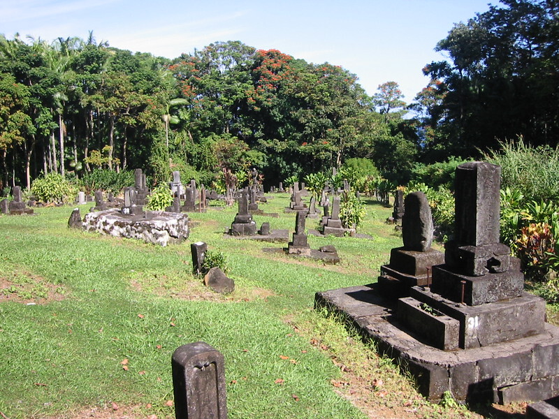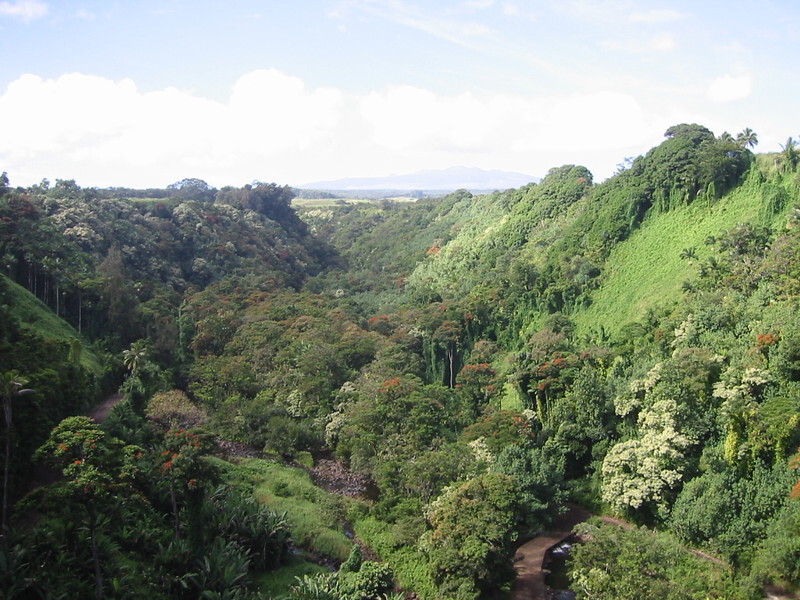 There are plenty of places to leave the highway and follow the old Mamlahoa Highway, which is virtually traffic free and I turned left at the Umauma Falls sign for a nice detour and view of Mauna Kea across rolling green fields to cycle to the Waikaumalo Co. Park. This was a large wooden shelter in the deep shade of the forest, above the small burn and resonant with the song of a multitude of forest birds. There seemed to be some trails into the forest from here and the usual grafitti on the toilet walls but it was fine for a rest, toilet break and a bit to eat with the goodies I got from the shop on the Onomeia road.
