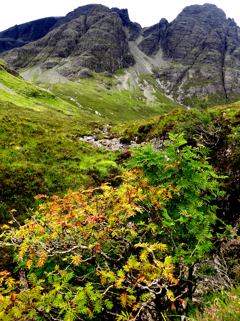 Later, as it colded up, I descended steep and loose ground to the bealach and ran up the other side to my other place. The rock that gives shelter in any wind. I lay there for a while too, then ran back down into the coire and sat at the lunch stone again. Soaking up the atmosphere as the wind rose and the cloud came lower on Blaven. It was time to head back down. The rowans were turning and autumn is not far off.