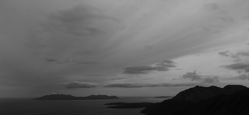 I went steeply up a grassy ramp to the foot of the cliffs but the rock was steep and dripping. So I nudged round on a fading ledge into the next gully. The crack at the top was inviting, maybe about VDiff but it was too wet as well. Eventually I made it to the top, via winding leads of grass and the roughest of gabbro, where a cold wind swept my nature coloured rocks and: