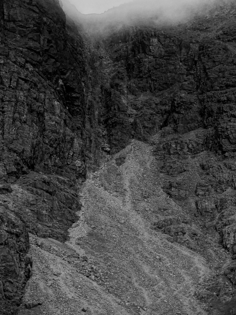 It’s been a quiet old time lately, hillwise but today I went out for a walk. Nothing much in mind, just a wander, to see where I ended up. On days like these I like to head up into the coire on Blaven and explore. There’s anticipation in the air as a storm is forecast to trundle in around three o’clock and ghostly wraiths wrap the summit now and then and my imagination takes me into another world.